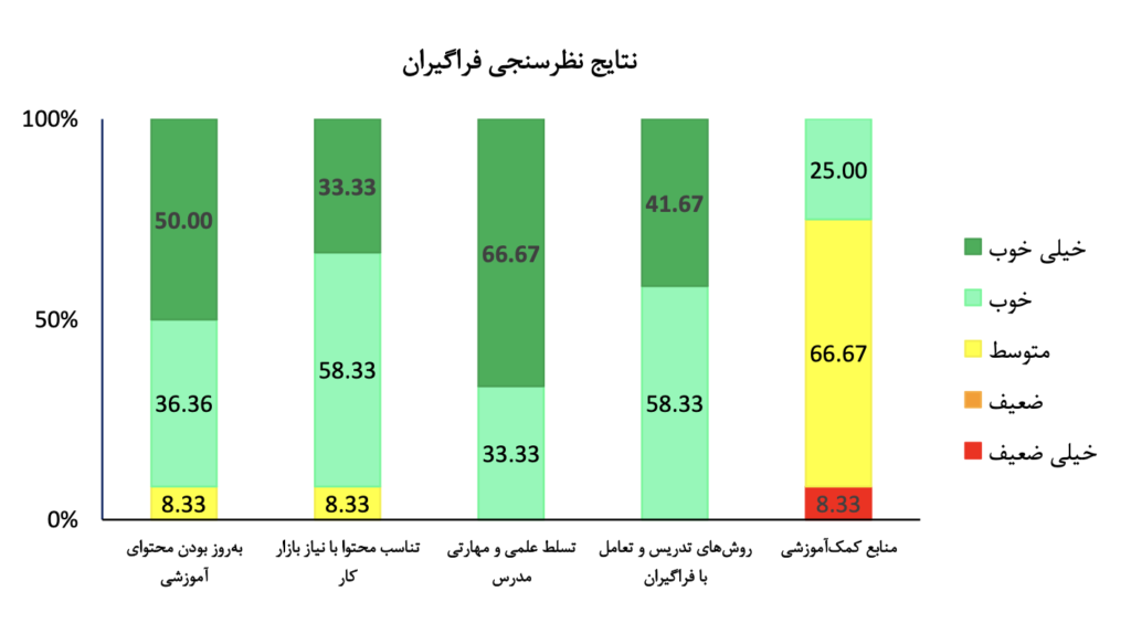 بهمنظور سنجش میزان اثربخشی کارگاهها، در پایان هر دوره، فرمهای ارزیابی در اختیار شرکتکنندگان قرار گرفت. نمودارهای ارائهشده در این بخش، خلاصهای از بازخوردهای ثبتشده توسط شرکتکنندگان را نمایش میدهد و مبنایی برای تحلیل کیفیت برگزاری کارگاهها و ارتقای مستمر دورههای آموزشی در آینده محسوب میشود.
