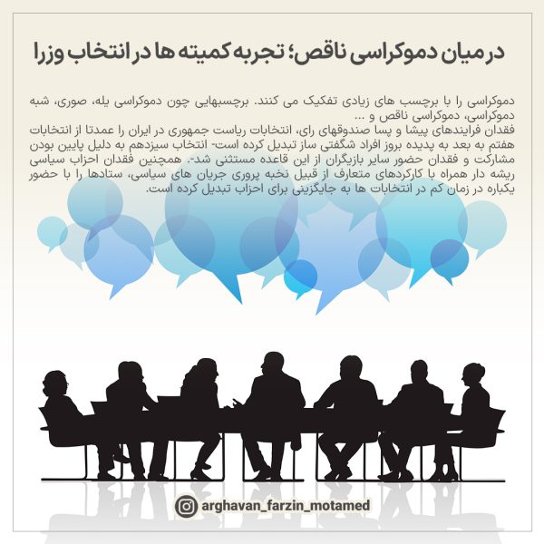 در ميان دموكراسي ناقص تجربه كميتهها در انتخاب وزرا Sadra_rn13 مرداد 1403علي ربيعي و ارغوان فرزينمعتمد در یادداشتی مشترک تحلیل کردند دموكراسي را با برچسبهاي زيادي تفكيك ميكنند. برچسبهايي چون دموكراسي ... ادامه مطلب
